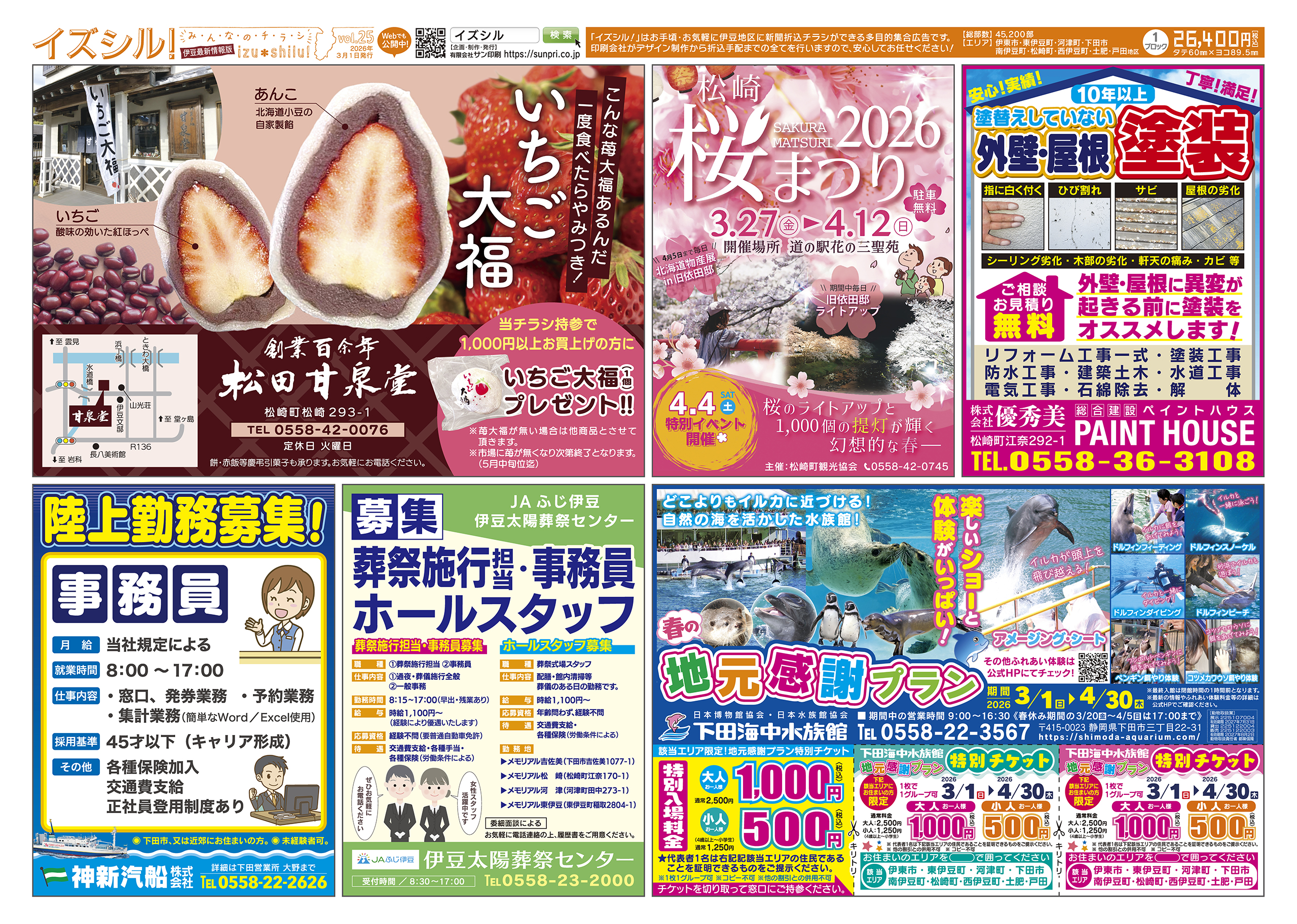 伊豆のお得な情報いっぱいの集合チラシ、イズシル! ヒカリ薬局、伊豆今井浜東急ホテル、(有)正木石油商会、(株)伊豆クルーズ、フレッシュ衣料うすい、眠りの専門店しらい、伊豆太陽葬祭センター (掲載順、敬称略)