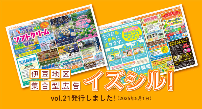イズシル! vol.21を発行いたしました 2025.05.01 イズシル!は、静岡県 伊豆半島の地域に密着した、集合型広告チラシです。令和7年5月1日に、イズシルvol.21を発行いたしました。イズシル専用webサイトから、拡大して詳しくご覧いただけます。ぜひご利用ください。 イズシル! チラシを見る ▶︎