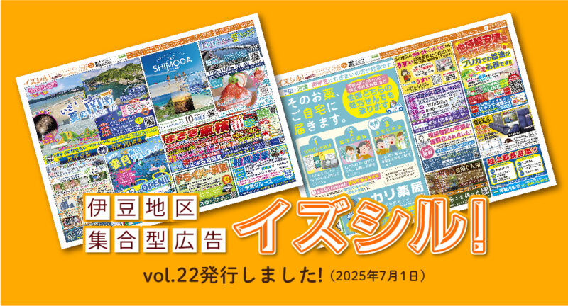 イズシル! vol.22を発行いたしました 2025.07.01 イズシル!は、静岡県 伊豆半島の地域に密着した、集合型広告チラシです。令和7年7月1日に、イズシルvol.22を発行いたしました。イズシル専用webサイトから、拡大して詳しくご覧いただけます。ぜひご利用ください。 イズシル! チラシを見る ▶︎